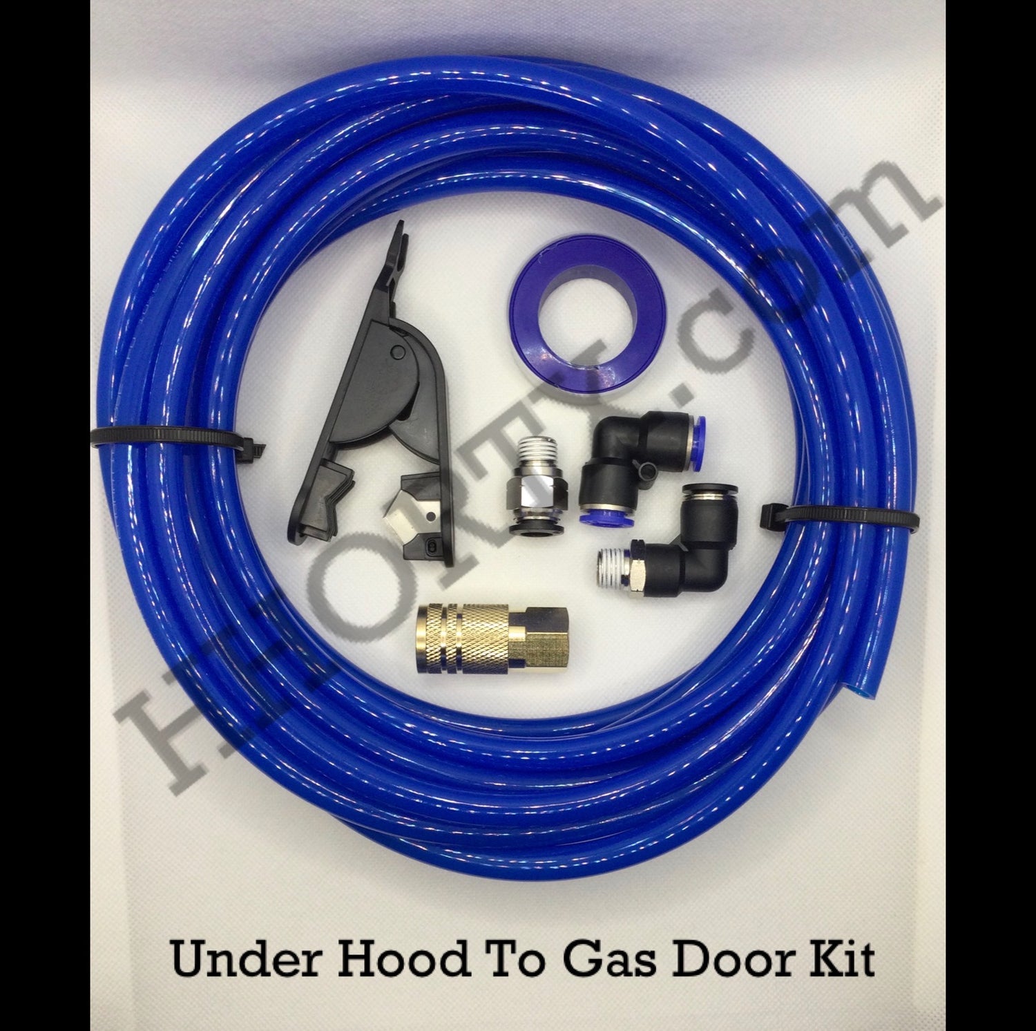 This kit takes a route between the engine bay battery area, along the upper fire wall, Down the passenger front wheel well, along the underside of the vehicle, up the passenger wheel well, to behind the gas fill well. Installation will only require one 14mm hole to be drilled, in the gas fill well. The fitings are tooless push to connect, press the collar to release.